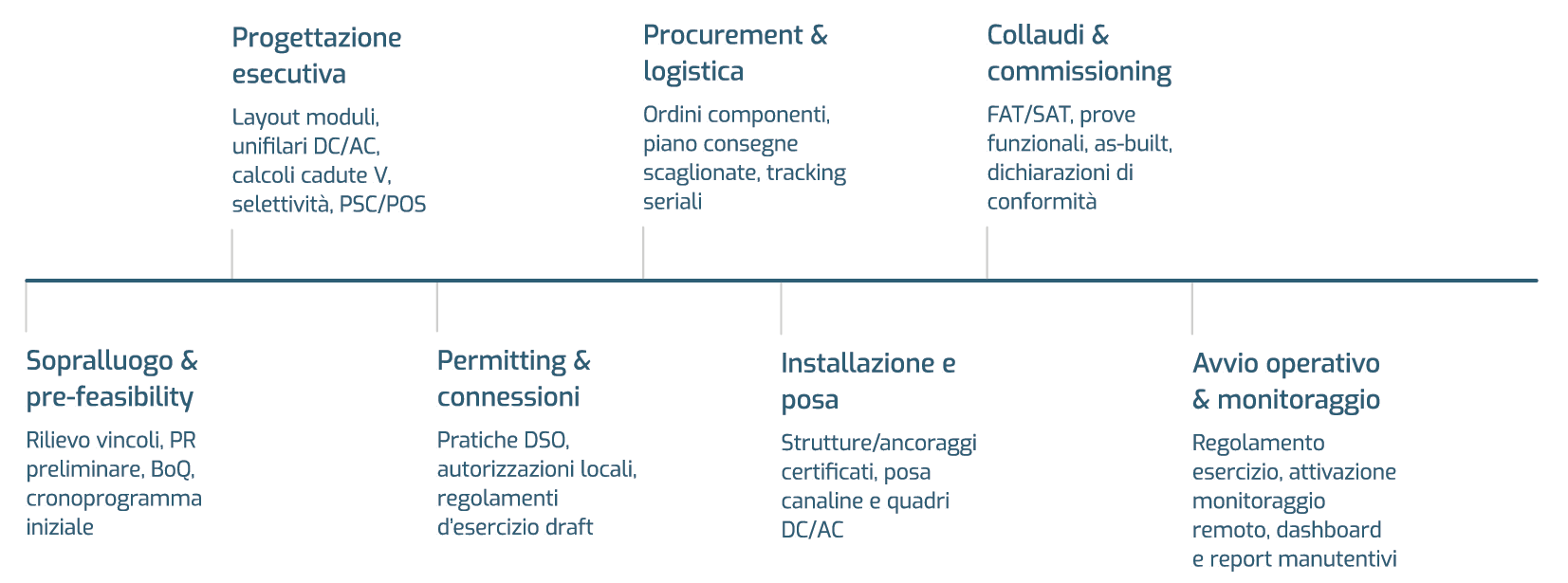- Collaudo e attivazione: test elettrici, integrazioni GSE/DSO, regolamento esercizio